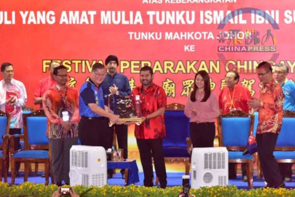 新山中华公会会长拿督斯里郑金财(前排左2)赠送纪念品给柔王储东姑依斯迈。