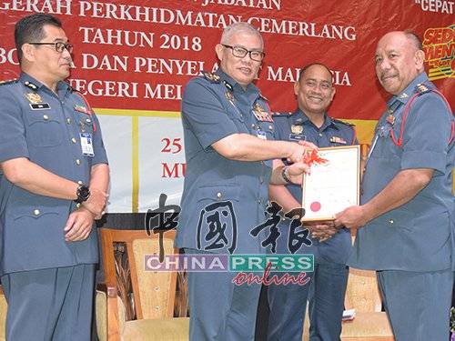 莫哈末韩丹(左2)颁发卓越服务奖给姑务消拯局局长卡马鲁查曼。左是莫哈末京沙烈,后是阿末再迪。