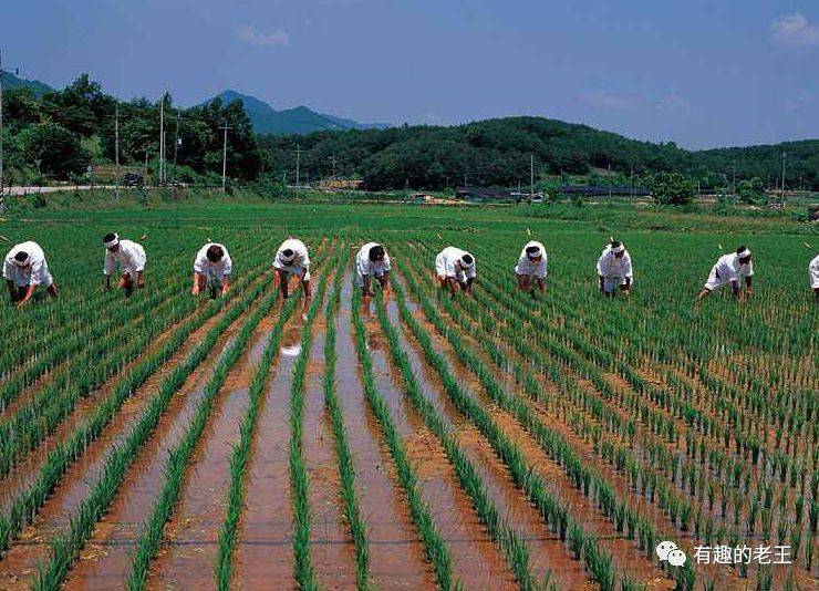 日本农民在进行水稻插秧
