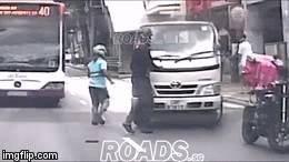 接下来,罗厘车司机突然启动车子,迅速急转弯,追着摩托车骑士行驶,直到骑士跑到自己的摩托车旁边,“疯狂”罗厘车“微妙地”撞到摩托车后停了下来,而摩托车几秒种后倒在了地上...