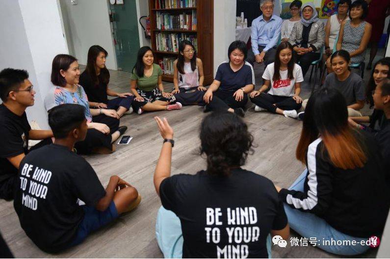 哈莉玛总统(前排椅子中)昨天访问新加坡心理健康协会创跃中心,聆听青少年和义工的小组分享。(萧紫薇摄)