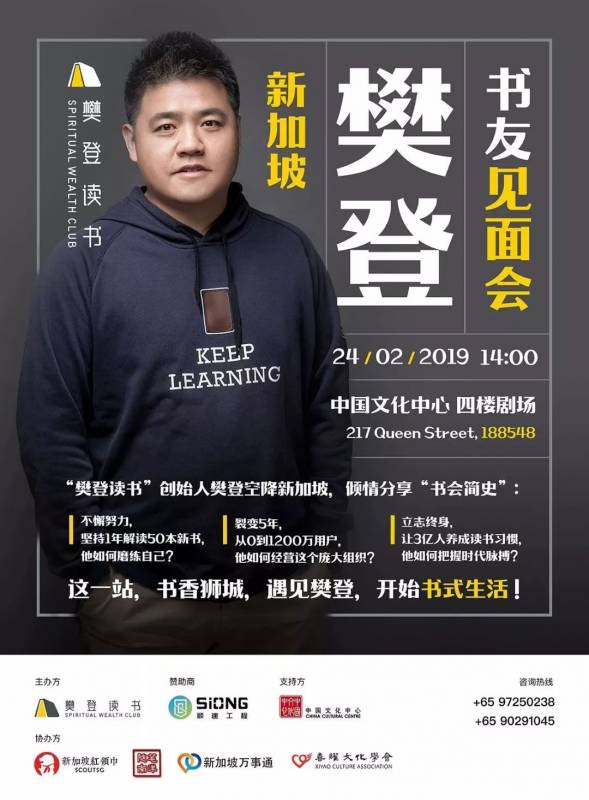 2019年2月24日下午,《从零开始,集结1200万读书人》的樊登新加坡书友见面会,在新加坡中国文化中心举行,开办了36次的樊登线下读书活动的新加坡授权点的众多书友们,终于在这儿迎来了这个难能可贵的和樊登亲自见面的机会。