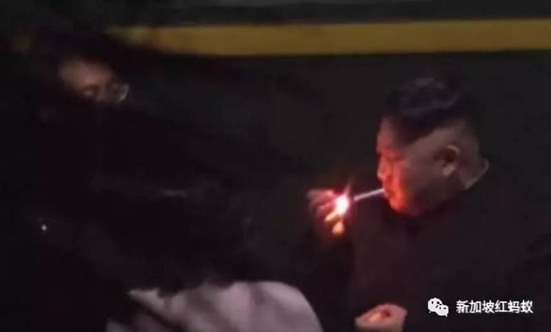 金正恩下火车后,自己用火柴点烟。(视频截图)