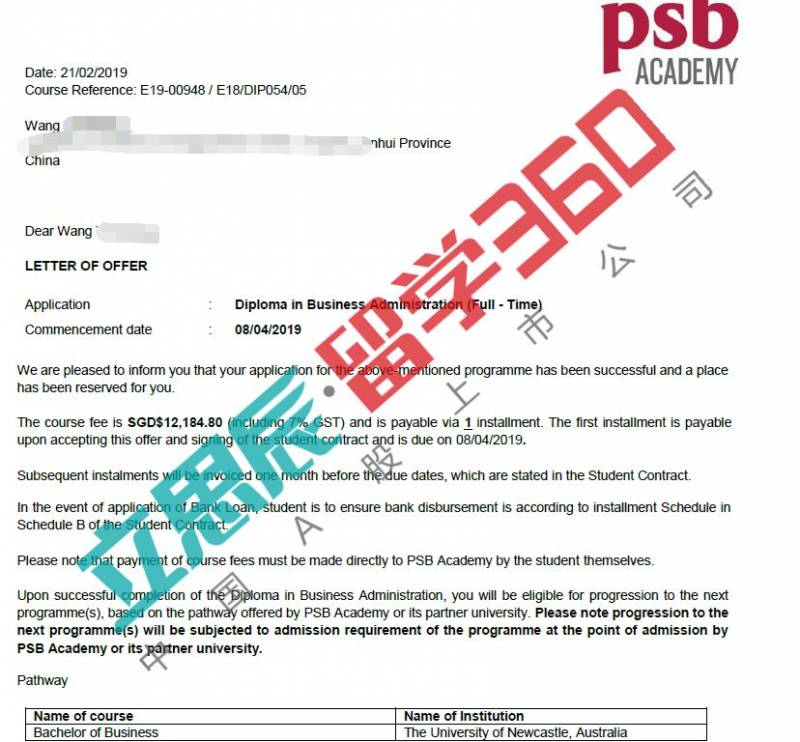 王同学2017年高中毕业,雅思是5.5分,之前申请的是马来西亚留学。不过,后来觉得新加坡比马来西亚更安全,将来留下来工作的可能性更大,所以转而申请新加坡。由于学生已经高中毕业2年多了,想尽快完成本科。所以选择了最近的PSB学院的4月开课。之前办过马来西亚留学,所以资料基本都有,再补充点就可以了。新加坡的本科只需要2年,这样,和国内的同学毕业时间差不多。学生在选择学校的时候也考虑很多,主要考虑毕业后获得的是哪个大学的文凭,世界排名如何,综合对比下来,觉得澳大利亚纽卡斯尔大学的排名好,专业也是自己想读的。