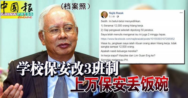 (吉隆坡26日讯)教育部受促审查自今年1月生效的学校保安合约中,把每天2班制改为3班制的条款,免1万2000名学校保安丢饭碗!