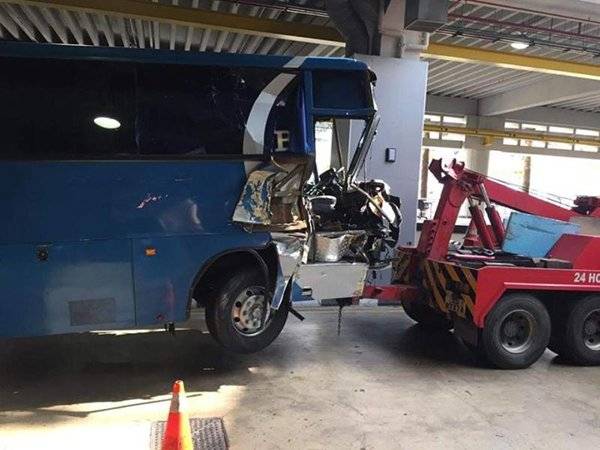 有网民上传巴士被拖走的照片,显示车头严重损毁。(取自面子书)