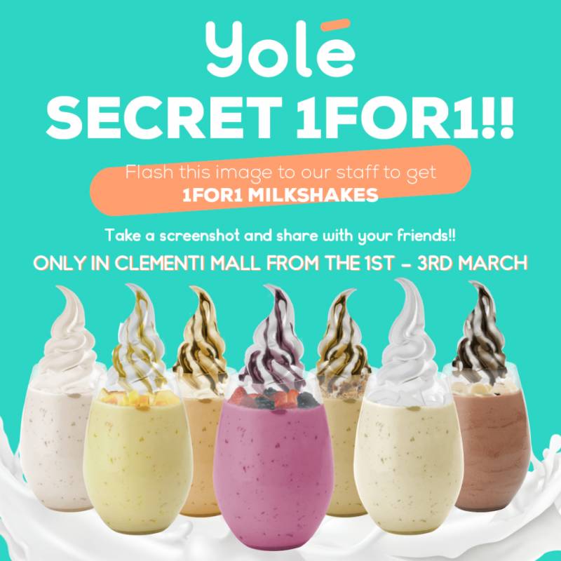 1.Yolé秘密促销:奶昔买一送一!【3月1日至3日,仅限Clementi新店】