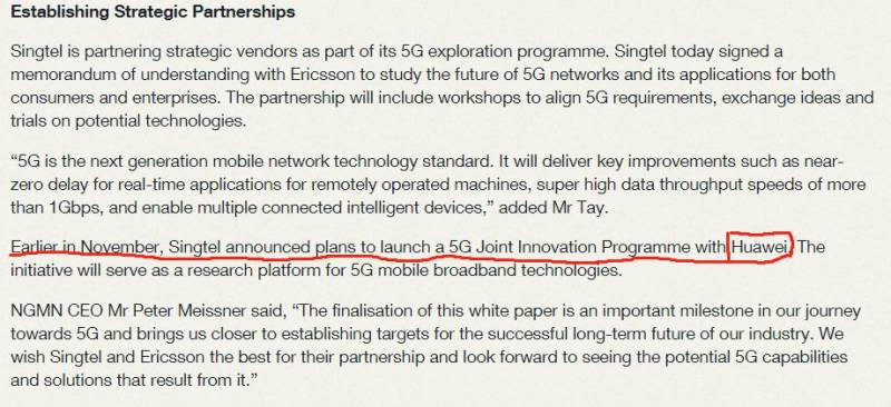 早在2015年11月,新加坡最大的电信商Singtel就宣布和华为共同建设5G网络。