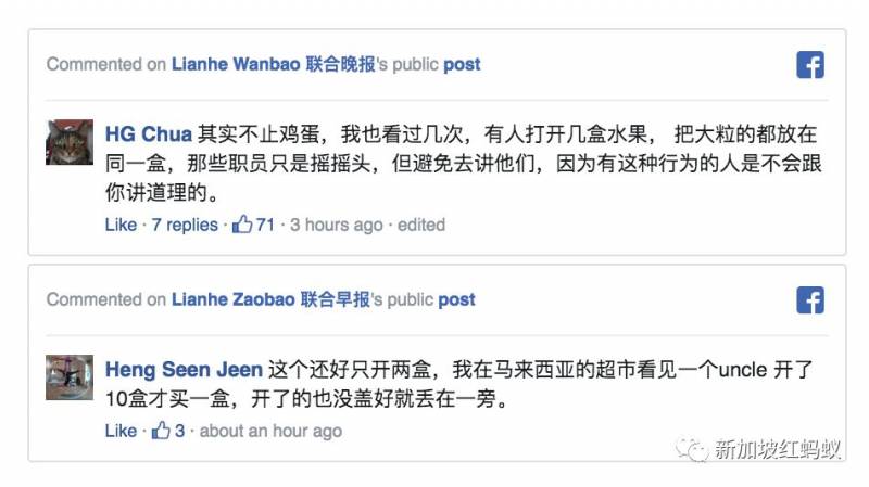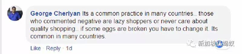 这位网民就说,像视频中的阿嫂式挑选鸡蛋在很多国家都很常见,难道破了不换吗?他还呛其他骂阿嫂的网民说,是因为你们懒惰所以没有关心产品的质量。(不知道这位网民是没看清楚阿嫂是在小蛋换大蛋,还是他到过的国家的风俗都非常奇葩,红蚂蚁认为如果一盒鸡蛋里有破的,就通知超市,自己才另选一盒,不就行了吗?)