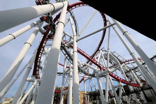 还有世界最高的双轨过山车,红蓝两条轨道同时发车,在突然的扭转和快速的下坠中体验与对面的游客贴身而过的惊险与刺激。不过此类惊险项目比较适合家长和大一点的孩子玩,且有身高限制,小一点的孩子可以同萌萌的小黄人合影,也可玩玩开车、旋转类较温和的项目。