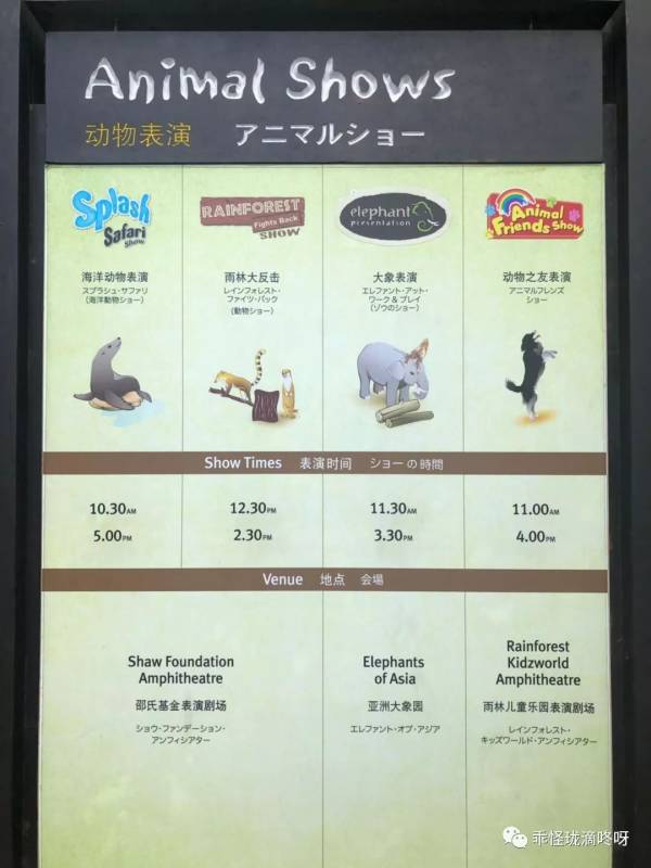 开放时间是8.30,我们9.30到人不算多,换票很舒服就进去了,没排队,最早表演10.30足够到达位置。表演时间表如下图,大家可以提前15分钟去占位置。海洋动物表演相对比较好看,但跟冲绳和大连以及北京的没法比,呃,或者叫风格不一样吧!新加坡比较重视人与动物和谐吧,显然没有日本很严格的训练,也不会有中国那种恢宏的场景和玄幻的情节,但是很温馨。大鱼大肉吃多了,小吃尝尝也爽口哒。