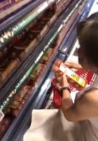根据郑姓网友于周一(25日)上传至面子书的视频显示,一名身穿白色上班服的中年女子在超市内挑选鸡蛋。