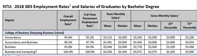 从单个学校的数据看,NTU的商学院就业率不错,商务与计算机的毕业生全都找到了工作,月薪约为4450新币。