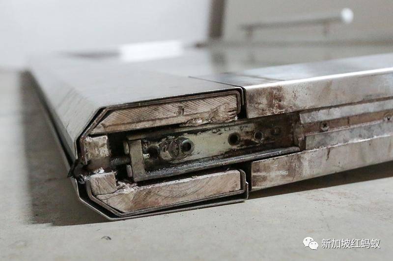 在四楼倒下的玻璃门的衔接处已明显受损,螺丝已松脱;但门没有刮伤、裂痕,也没有碎片。(联合早报)