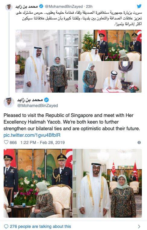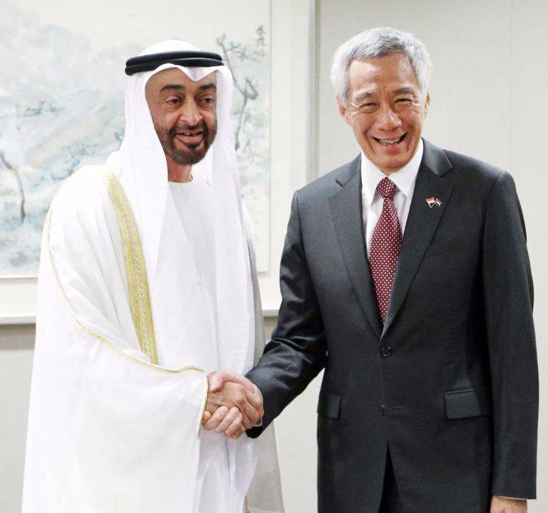 李显龙设晚宴招待穆罕默德,两人在宴会上讨论了亚洲和中东的发展。穆罕默德此行也参观了由阿布扎比主权财富基金穆巴达拉所拥有半导体公司“格芯”。傍晚时分,穆罕默德参观著名景点滨海湾花园。