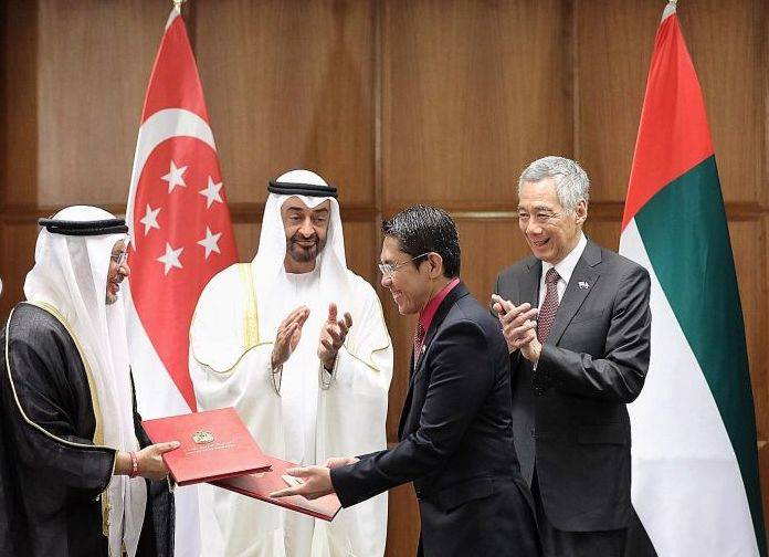 李显龙总理昨天和阿布扎比王储兼阿联武装部队副总司令穆罕默德,在国会大厦见证《新加坡—阿拉伯联合酋长国全面伙伴关系联合宣言》和另外三份谅解备忘录的签署仪式。