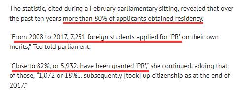 超低的生育率直接影响到新加坡的政策,留学生转永居便是其中一个最明显的体现!为什么留学生申请绿卡批复率高?因为留学生在新加坡受到的当地的良好教育,已经从语言和文化都开始慢慢融入这个国家,新加坡当然是更加欢迎受过他们国家教育的人才留下来了。事实也表明,新加坡政府确实想留下优秀的留学生们: