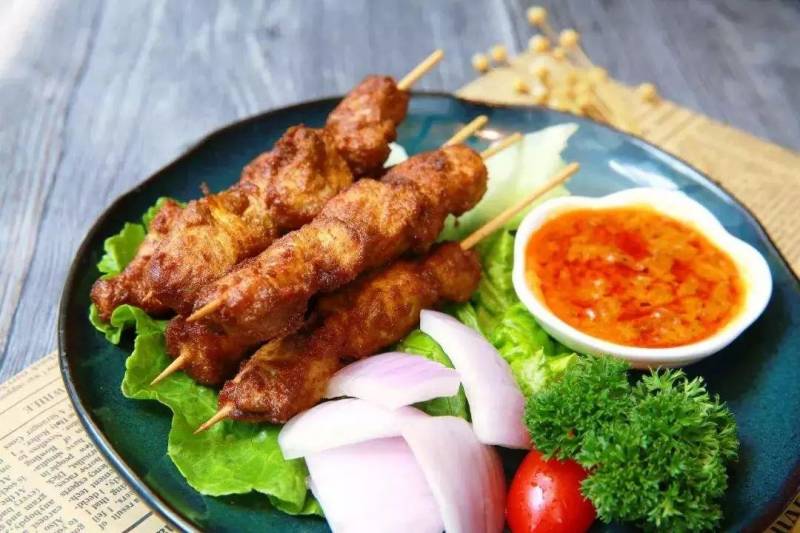 沙爹通常成10串进行售卖,蘸点甜辣的花生酱口味则更加独特,通常还搭配洋葱片、黄瓜片以及裹在椰子叶中的马来饭团(ketupat)一起吃。