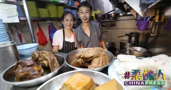 一碗热烘烘的粿汁,是小贩的心血结晶;16种不同的配料,让顾客凭喜好选配搭。 夫妻共同经营档口,合作无间。(梁麒麟摄)