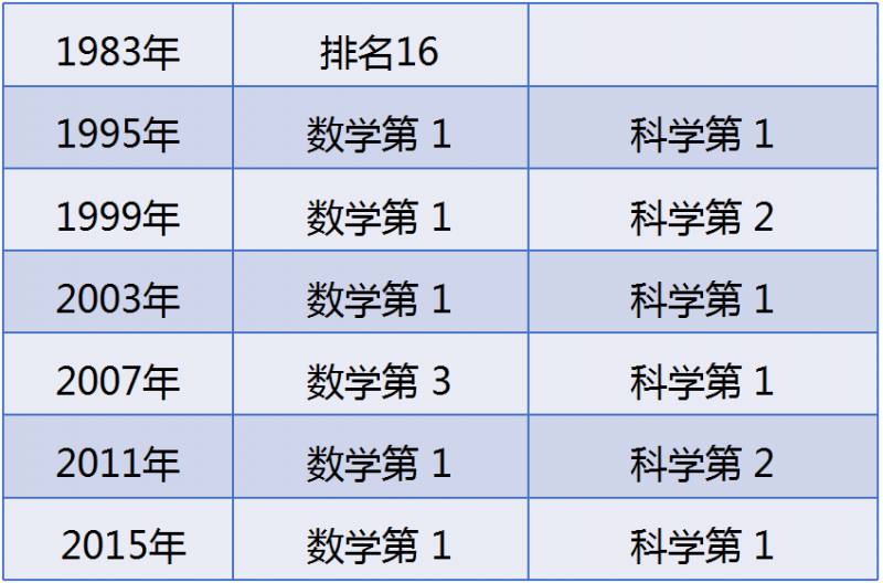 另外,新加坡自1983年开始参加由国际教育成就评估协会(The International Association for the Evaluation of Education Achievement,简称IEA)主持的学生数学科学能力测评,过去多年的成绩如下: