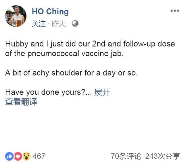 昨日,李显龙总理的夫人何晶在社交媒体Facebook发文,说自己和丈夫刚接受了第二剂肺炎链球菌疫苗(pneumococcal vaccine)的注射。