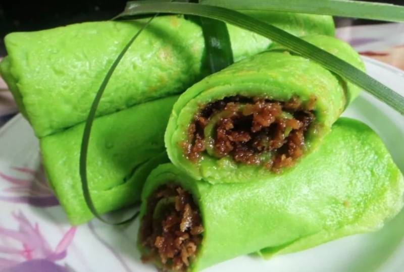 迎来了第一个经典东南亚绿的甜点,在这里看到鲜艳的绿色不用慌张哦。马来甜点中会加入用斑兰叶榨的汁,味觉和视觉同时满足你。这个里面包的是椰糖和椰丝,饼皮有一点薄蛋饼的感觉,软软的口感很好吃。