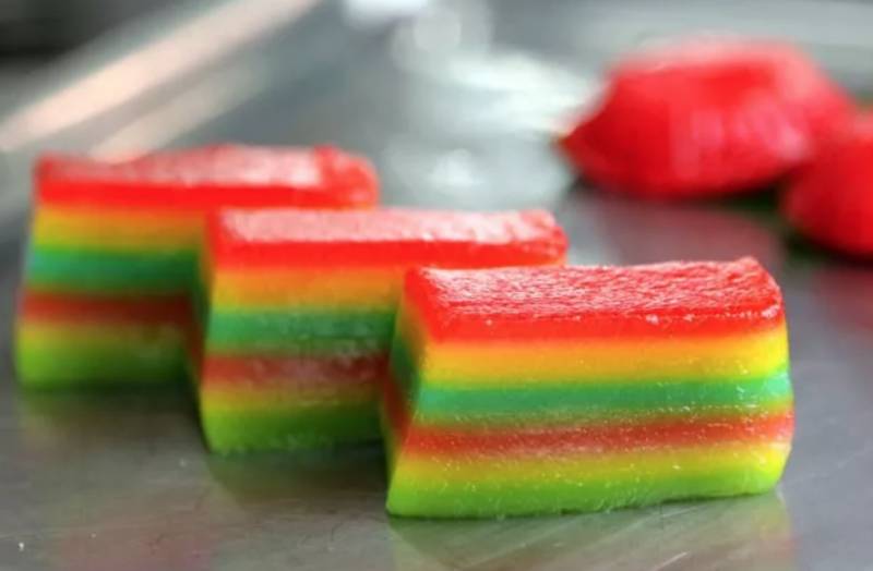 彩虹色的千层粿,是不是看着非常眼熟?这是一道经常出现在食阁甜品区的点心,味道非常香甜,口感和布丁相似。颜色的艳丽几乎全部来源于天然食材,心存疑虑的小伙伴也可以放心食用。