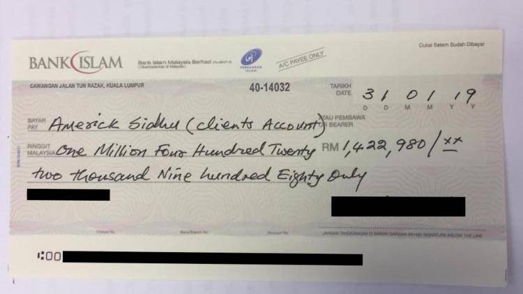 支票注明支付142万2980令吉给西杜。(取自“砂拉越报告”)