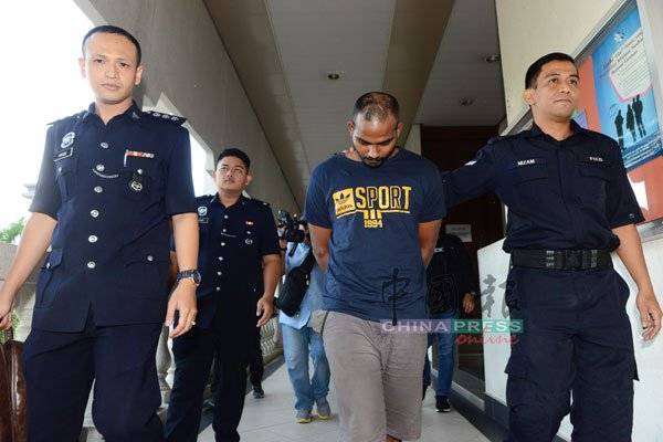 迪纳达亚兰(中)被庭警押送往另一个法庭,以面对抢劫提控。