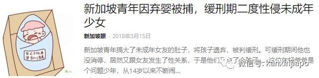 2018年,一名新加坡青年搞大了未成年女友的肚子,女方产下孩子后将其遗弃,被判缓刑。缓刑期间他也没消停,又跟女友发生了性关系,女友再度怀孕……