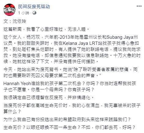 沈依玲在面子书“民间反废死运动”专页贴文时指出,杨巧双站出来为废死背书,还指:“除了聆听受害者家属的悲痛,同时也需要聆听死囚父母要求第2次机会的声音。”