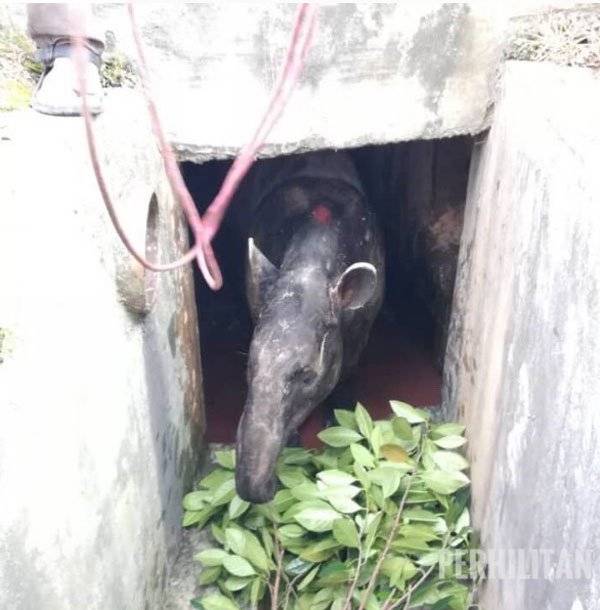 最终有关当局出动起重机,将马来貘从水沟中救出来。