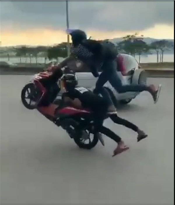 广告根据“我们是马西亚人”面子书上载的视频中,这起事件发生于槟城北海外环公路,2名男子驾驶着一辆摩哆,1名男子双手驾驶着摩哆,但身体凌空“飞起”,一只脚后扬,只用一只脚平衡著摩哆前进。