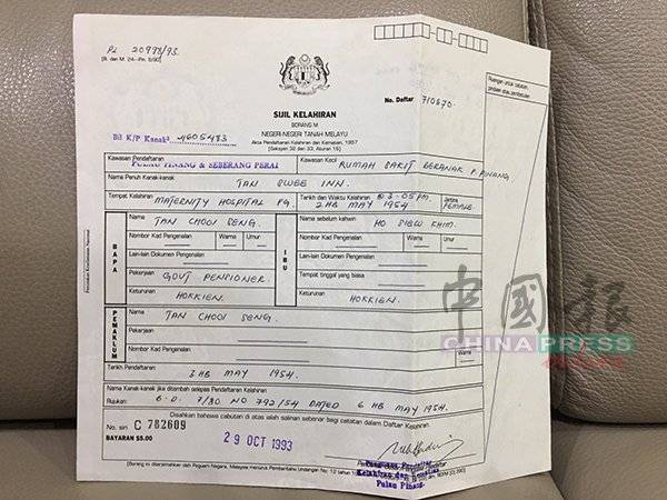 据报生纸资料,父亲姓名栏目是Tan Chooi Seng,职业栏目写着痛风症福利金领取者。母亲姓名栏目写着Ho Siew Khim,两者籍贯栏目是福建,其他身份证、住址、年龄等栏目皆空白。