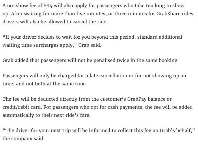 从2019年3月11日起,Grab乘客可在叫车的五分钟内免费取消电召,但乘客如果让司机等超过五分钟,司机可取消服务,乘客还得支付4元额外费用。不过,如果司机在预计抵达时间的五分钟后仍未出现,乘客可以免费取消电召。