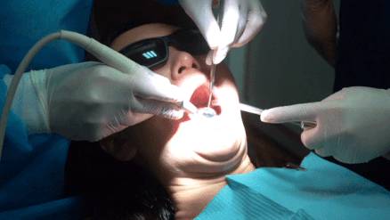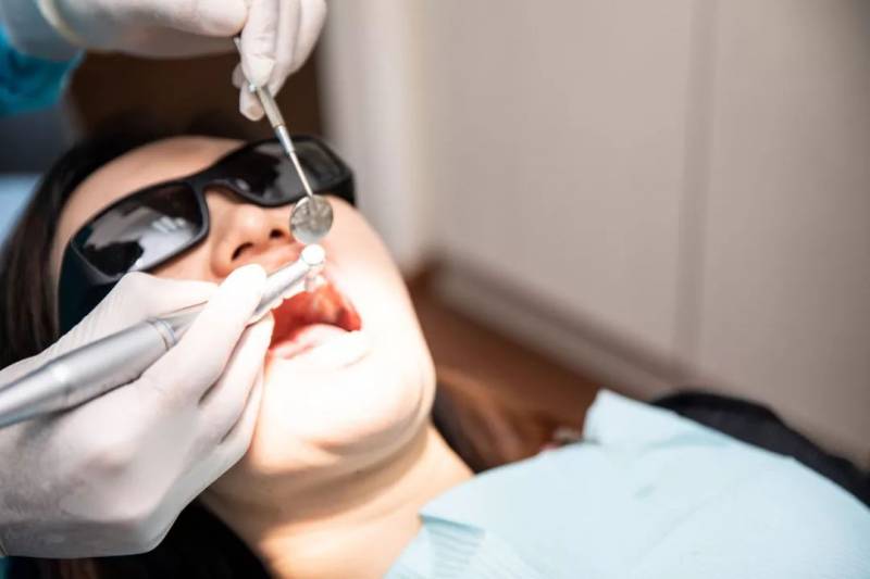 对于初次洗牙的顾客来说,洗牙前,洁牙师询问顾客是否有高血压、心脏病等系统疾病,以及是否有药物过敏或正在服用的药物等问题,而后会进行一个简单的口腔检查,以此判断牙周状况;之后,护士小姐姐会为顾客带上防辐射的眼镜,洗牙就正式开始啦。