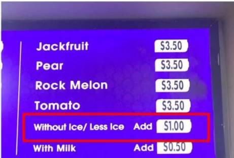 付钱时你会发现坑爹!一杯加冰的果汁$3.5,去冰竟然要$4.5,去冰竟然多收了1/3的费用。