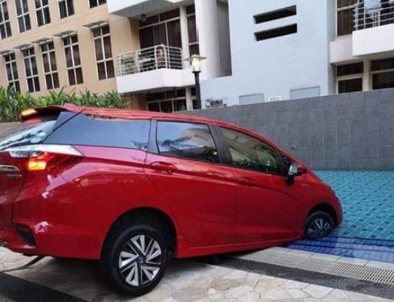根据网上流传的照片,一辆红色本田Shuttle轿车不知何故开进公寓里的游泳池,两个前轮几乎“陷”进水里,须出动拖车把轿车拖走。
