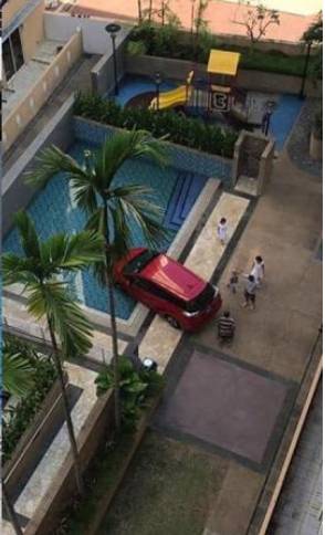 当时,公寓入口处有两名值班保安人员。入口处设有交通圈作为载客点,而涉事红色轿车其实是一辆私召车,司机当时驶入公寓准备载客。然而,这位老司机可能是没有找到准备载送的乘客,竟直接开进公寓里的行人道,越过七八米左右的草坪才停下。司机这时意识到自己走错路,打算U转回去交通圈,却在过程中不慎开进游泳池。
