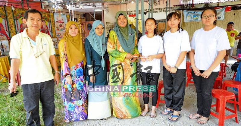 黄淑萍(右3)接领学校教师代表艾达移交的抚恤金,左为家协主席吴俊钦。