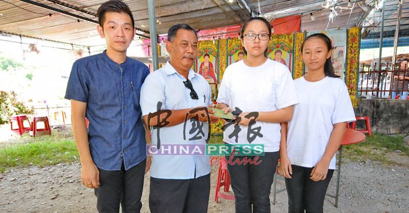 黄淑慧(右2)接领村委会主席阿末卡马移交的抚恤金,左为峇眼色每国会华人事务官黄喠俊,右为黄淑萍。