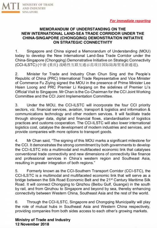 新中双方于2017年11 月将中新(重庆)战略性互 联互通示范项目旗下的“南向通道”,正式更名为“国际陆海贸易新通道”。