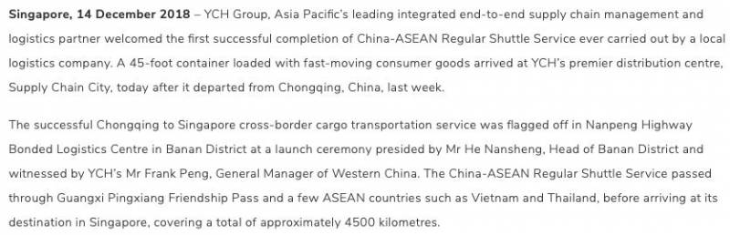 由重庆到新加坡的陆路货运,2018年12月15日首次成功完成全程4500公里的测试,标志着这条跨境公路货运通道首次全线贯通。 这班货车由重庆巴南出发,日前早上8时许抵达叶水福集团(YCH Group)位于“裕廊创新区”的仓储设备“供应链城”(Supply Chain City)。该集团是新加坡第一家提供由重庆到新加坡陆路货运服务的公司。