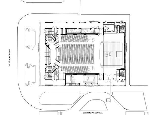 Gateway Theatre是栖息在红山中心的多功能展演剧院,它以观者体验和社会参与为建筑主旨,服务于社会大众。剧院的正立面向Bukit Merah大街开放,穿行在街道上的人们可以在此驻足停留,感受与城市生活的亲密融合。