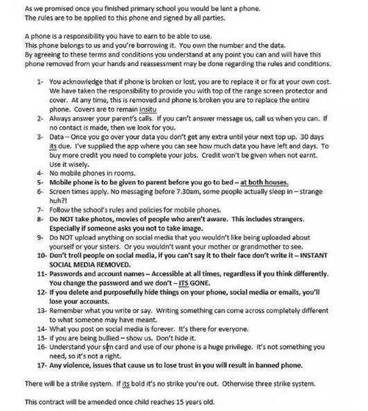 于是,她起草了一份使用手机的“合同”,里面罗列了17条关于手机的使用方式,并且还将几条加粗以示警告: