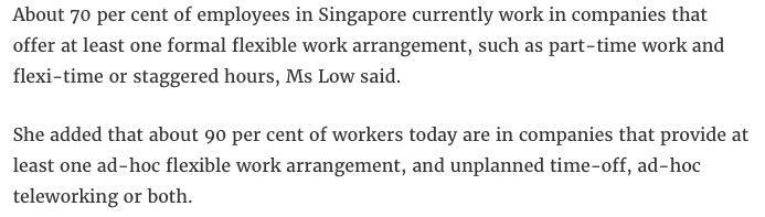 有越来越多属于不同产业领域的企业让有需要的员工采取灵活工作安排,据统计,目前每10名本地员工就有七名,在至少提供一项正式灵活工作安排的公司任职。每10名员工有九名,所任职公司允许员工在必要时临时请假或申请在家办公,以应付私人或家里的需要。