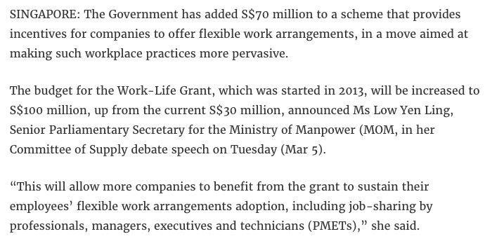 新加坡人力部2014年推出的工作与生活平衡津贴计划,协助雇主支付发展、试验和长期推行灵活工作安排。根据现有的加强版计划,公司在两年内可领取最高10万5000元的津贴以便实行相关雇佣做法及工作安排。