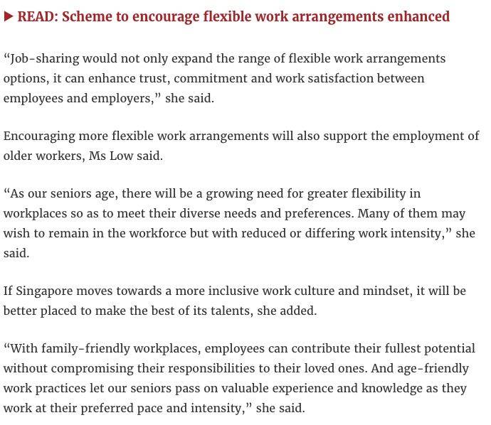 新加坡人力部高级政务次长刘燕玲说,希望更多企业透过计划,为妇女、年长员工及需要看护家中病患的员工提供灵活工作安排。“实际上,受益于这个趋势的不仅是雇员,雇主也能享有正面效应。灵活工作安排是众多公司政策中,最能帮助公司留住资深与负责任员工的措施。”