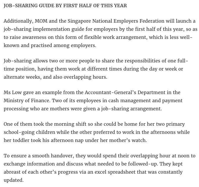 新加坡人力部将同全国雇主联合会联合制定“共享工作职位”(job-sharing)执行手册,以提升雇主对这项灵活工作安排的认识,并教导雇主如何实行措施。手册预计今年上半年推出。