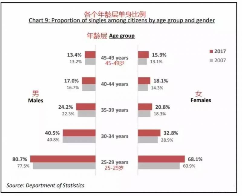 据新加坡《2018年人口简报》显示,新加坡人口中有75%是华人,25岁至29岁女性群体有近7成单身,同个年龄段男性单身者则从77.5%增至80.7%。